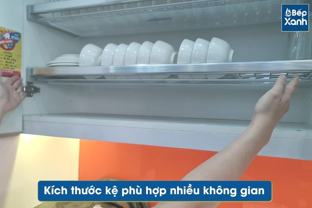 Chiều dài x rộng x sâu của kệ chén lần lượt là 86.5 x30 x 65 cm, thích hợp đặt vào ngăn tủ trên có chiều rộng 90cm. Với kích thước này sẽ phù hợp với nhiều không gian có tủ bếp có diện tích rộng, nhu cầu cất trữ chén bát nhiều, đem đến sự gọn gàng và thẩm mỹ khi sử dụng.