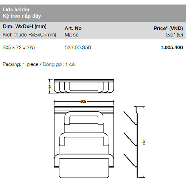 >> Đóng gói kệ treo nắp đậy Hafele 523.00.350: 1 bộ