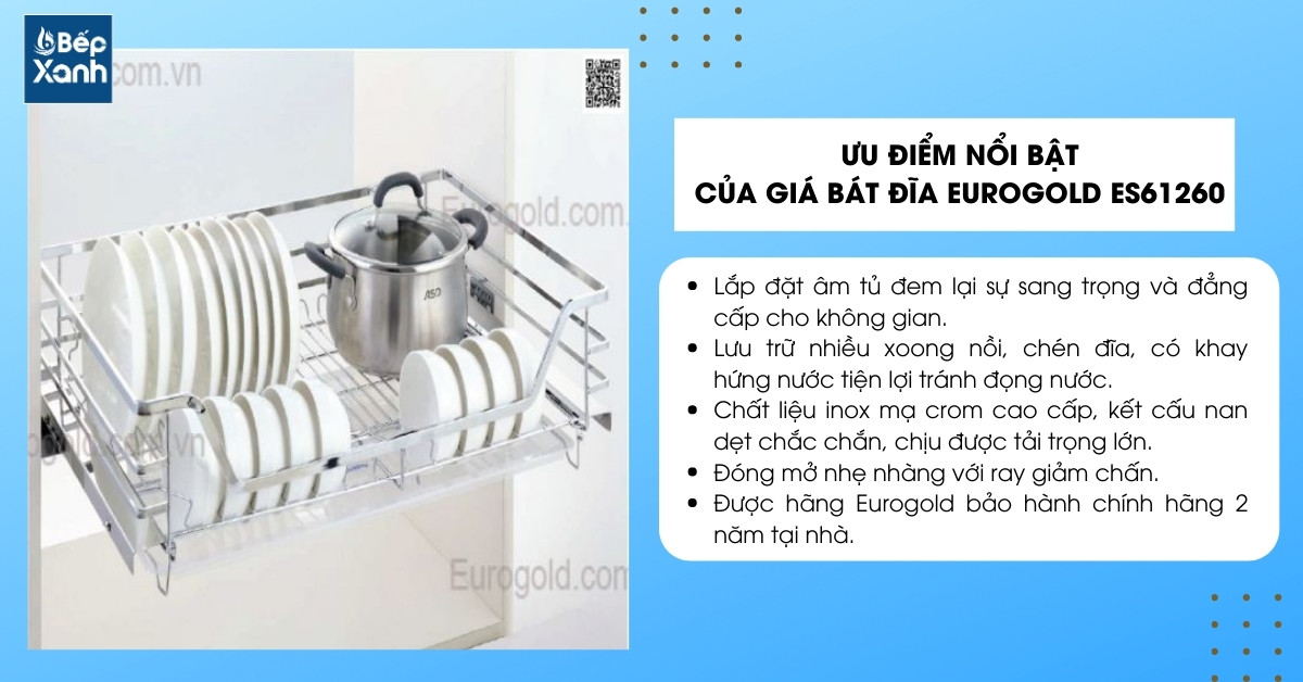 Giá chén đĩa nan dẹt gắn cánh Eurogold ES61260 sở hữu nhiều ưu điểm nổi bật về thiết kế, tính năng, chất liệu,... sẽ là phụ kiện tủ bếp dưới lý tưởng hoàn thiện căn bếp hiện đại của gia đình bạn. Hãy đến ngay Bếp XANH để được hỗ trợ tư vấn và mua sắm với giá ưu đãi nhất nhé!