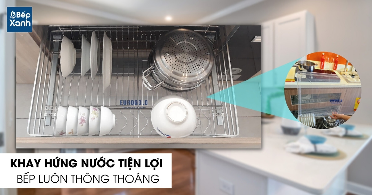 Để đảm bảo bếp luôn khô ráo, thoáng mát, bên dưới giá bát đĩa âm tủ Eurogold EP60 được trang bị thêm khay hứng nước tiện lợi, có thể tháo rời dễ dàng để đổ nước và vệ sinh. Điều này cũng góp phần bảo vệ tủ bếp của nhà bạn không bị ẩm mốc, hư hỏng do nước thấm vào bên trong tủ.