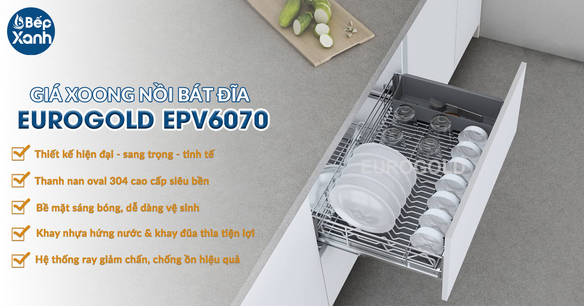 Giá xoong nồi bát đĩa Eurogold EPV6070 là sự lựa chọn hoàn hảo dành cho những khách hàng hướng đến căn bếp hiện đại, gọn gàng và sạch sẽ. Sản phẩm sở hữu thiết kế hiện đại, cùng sức chứa tối ưu, giúp chứa được nhiều vật dụng. Đồng thời, sản phẩm được trang bị thêm nhiều phụ kiện đi kèm tiện lợi như khay đựng đũa thìa, khay nhựa hứng nước và hệ thống ray giảm chấn tối ưu. Với các ưu điểm trên đã giúp cho EPV6070 luôn được khách hàng tin dùng và lựa chọn tại nhà phân phối chính hãng thiết bị bếp - Showroom Bếp Xanh.