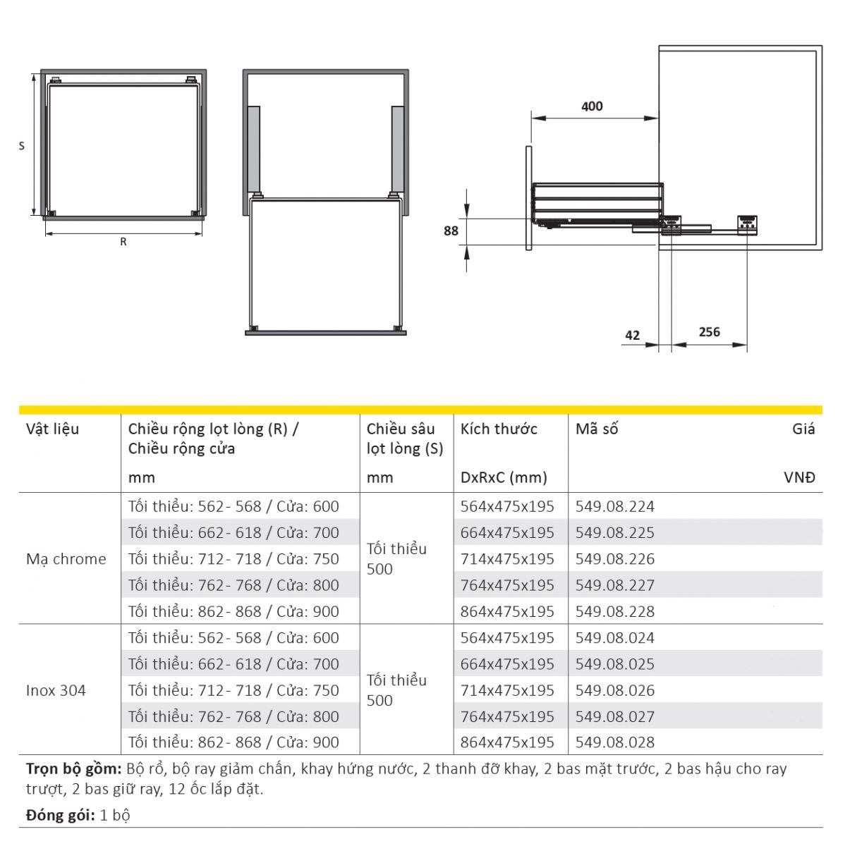 + Thành phần: Bộ rổ, bộ ray giảm chấn, khay hứng nước, 2 thanh đỡ khay, 2 bas mặt trước,2 bas hậu cho ray trượt, 2 bas giữ ray, 12 ốc lắp đặt.