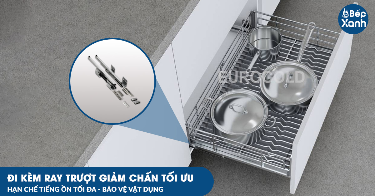 Kệ xoong nồi EPV5070 được hãng Eurogold trang bị thêm bộ phận ray giảm chấn, giúp hạn chế tiếng ồn khi khách hàng vô tình đóng tủ mạnh. Bên cạnh đó, ray giảm chấn còn bảo vệ vật dụng tối ưu nhờ cơ chế giúp tủ đóng mở êm ái, giúp vật dụng không bị va chạm mạnh vào nhau.