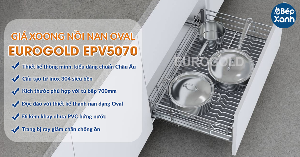 Kệ bếp dưới là loại phụ kiện bếp được nhiều khách hàng ưu tiên lựa chọn hàng đầu trong việc giúp cho vật dụng được sắp xếp ngay ngắn cũng như giúp căn bếp trở nên thông thoáng hơn. Trong đó, giá xoong nồi nan oval Eurogold EPV5070 được nhiều khách hàng lựa chọn và tin dùng tại Showroom Bếp Xanh. Sản phẩm được hoàn thiện từ kiểu dáng hiện đại, tích hợp chất liệu inox cao cấp siêu bền, cùng với nhiều phụ kiện tiện lợi đi kèm đã đem đến cho sản phẩm một tổng thể hoàn hảo.