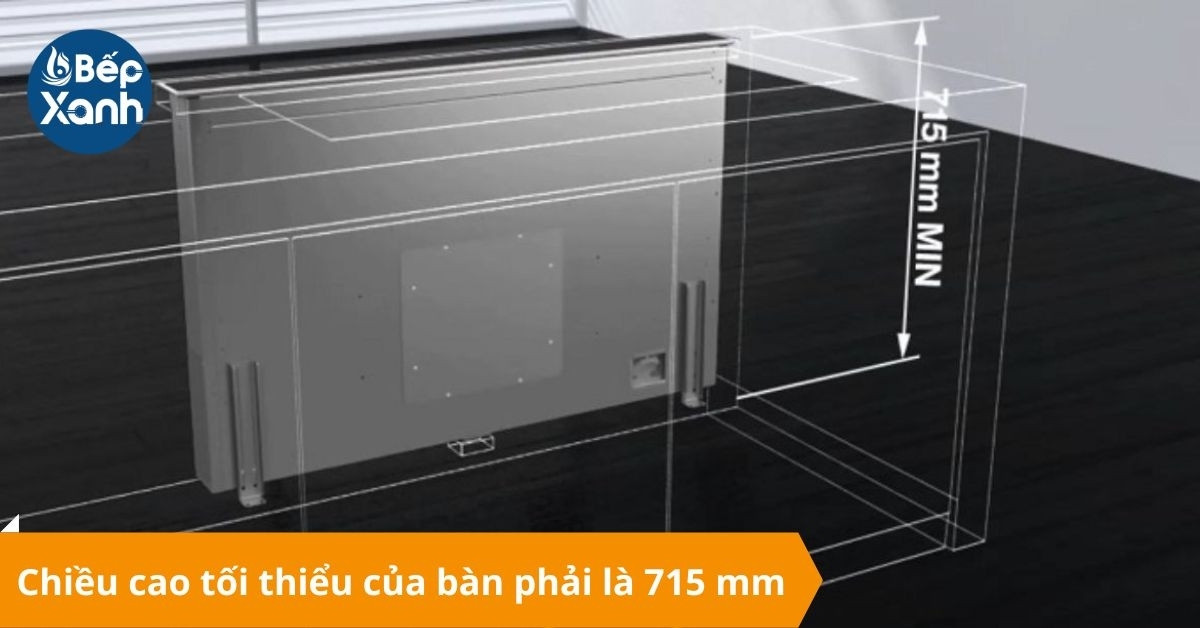 Bạn nên kiểm tra chiếc bàn dùng để lắp đặt máy hút mùi âm bàn để đảm bảo rằng có đủ diện tích cho máy hút khi lắp đặt, tránh trường hợp khoét lỗ xong mà không vừa thì sẽ rất khó cho các bước lắp đặt tiếp theo. Bên cạnh đó, mặt bàn của bạn cần đảm bảo độ cân bằng, tránh lắp đặt ở các bàn có độ nghiêng lớn. Độ cao tối thiểu của bề mặt bàn để lắp đặt máy là 715 mm nhằm đảm bảo máy hút mùi hoạt động hiệu quả nhất, tránh các sự cố xảy ra trong quá trình nấu nướng.