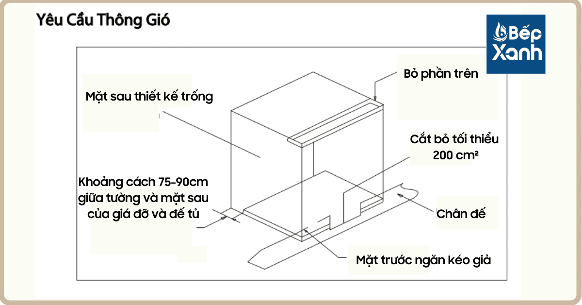 Hình minh hoạ yêu cầu thông gió và để lắp đặt thiết bị vào một bộ bếp tiêu chuẩn