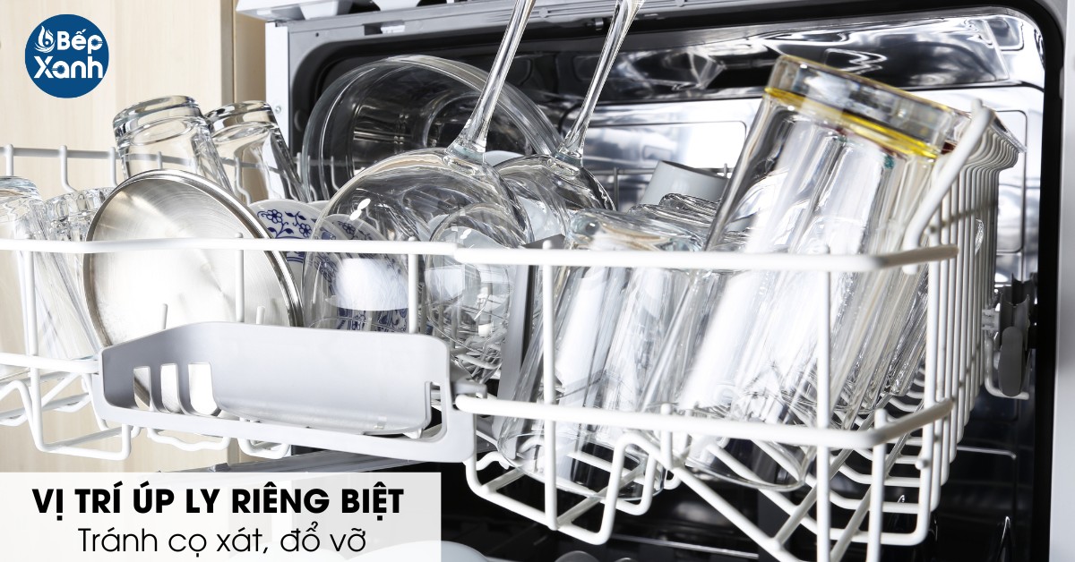 Tương tự như cách xếp bát vào máy rửa bát ở trên, tùy vào kích thước của các loại ly, tách, cốc mà bạn sẽ lựa chọn xếp ở giỏ trên hay giỏ dưới cho phù hợp. Với các loại ly lớn như ly rượu vang, ly uống bia,... khay rửa dưới máy rửa chén được thiết kế các khay úp riêng giúp người dùng úp xuống dễ dàng mà không lo bị đổ vỡ. Khi không sử dụng, bạn có thể gập lại để tạo khoảng trống lớn hơn cực tiện lợi.