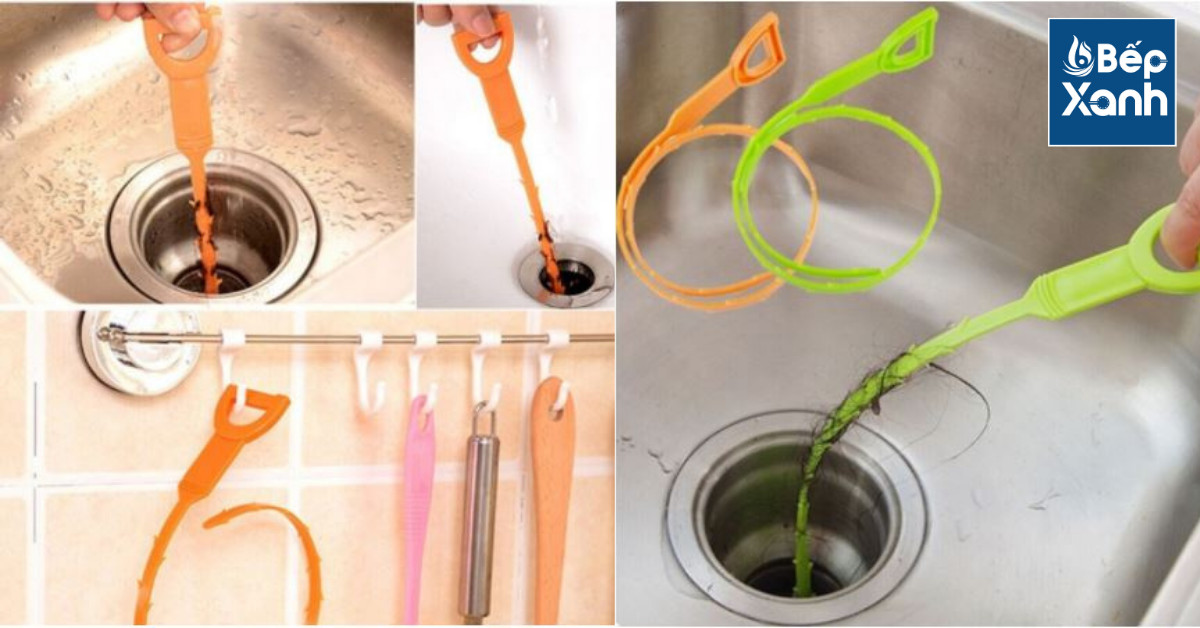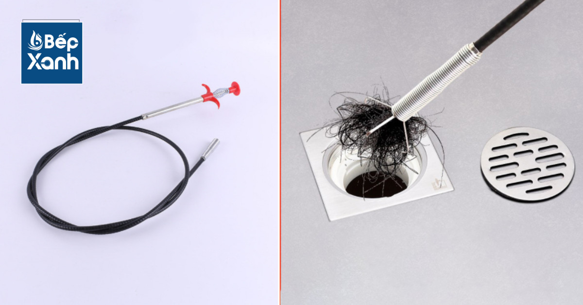 Dụng cụ này có chiều dài tầm 60cm, đầu trên là dây lò xo điều khiển và dầu dưới là dầu gắp. Chiều dài và độ mỏng của dụng cụ đủ để luồn vào các đường ống sâu, dễ dàng kéo các vật tắc nghẽn ra ngoài. Bạn chỉ cần đưa dây vào đường ống chậu rửa chén, khi gặp vật cản thì điều khiển đầu trên để gắp lên. Cách này sẽ rất hữu ích đối với vật làm tắc nghẽn chậu có kích thước nhỏ.