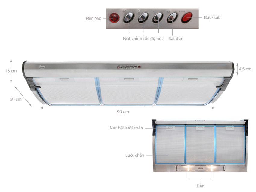 • Điều khiển nút bấm. • Chất liệu: thép không gỉ không in dấu vân tay. • Đèn báo hoạt động. • 03 mức công suất hút. • Công suất hút tối đa: 375 m3/h. • Công suất hút tối thiểu: 141 m3/h. • Độ ồn tốc độ hút tối đa: 72 dB. • Độ ồn tốc độ hút tối thiểu: 60 dB. • 02 đèn halogen. • 03 lưới lọc bằng nhôm