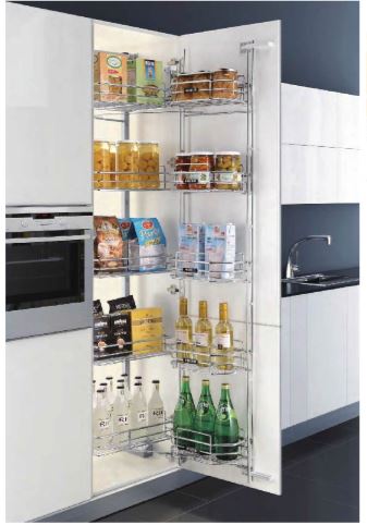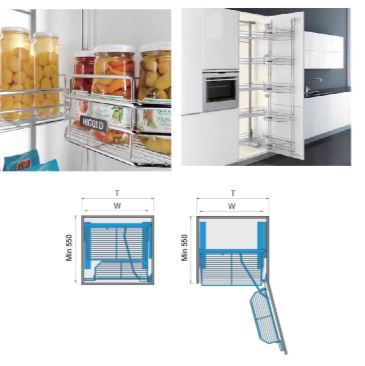 Kệ tận dụng tối đa những không gian nhỏ, thuận tiện cho các ngôi nhà phố hoặc chung cư. Bên cánh chứa 6 rổ chịu lực khoảng 45kg và bên trong tủ 6 rổ chịu lực khoảng 100kg.