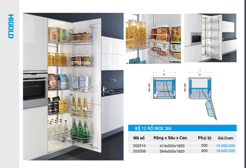 Tủ đồ khô inox 12 tầng Diamond- Higold 202210 với thiết kế rổ được làm bằng inox kết hợp đáy gỗ đệm cao su. Là một trong những phụ kiện tủ bếp được thiết kế dành riêng cho việc chứa các đồ vật có kích thước nhỏ dễ bị rớt, các loại thực phẩm khô trong nhà bếp.