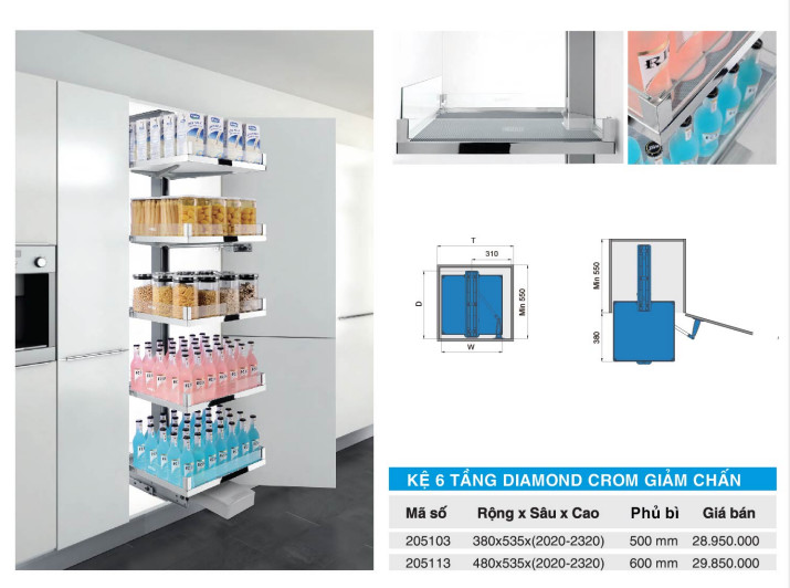 Kệ 6 tầng diamond giảm chấn 205103, 205113 : được thiết kế 6 tầng tương ứng với 6 rổ có thể điều chỉnh vị trí tùy theo nhu cầu bạn muốn một cách linh hoạt nhất. Các khung cố định mỗi bên thành vách của từng rổ một được làm bằng thủy tinh chắc chắn, với bộ ray trượt giảm chấn giúp bạn khi đóng mở tủ nhẹ nhàng.