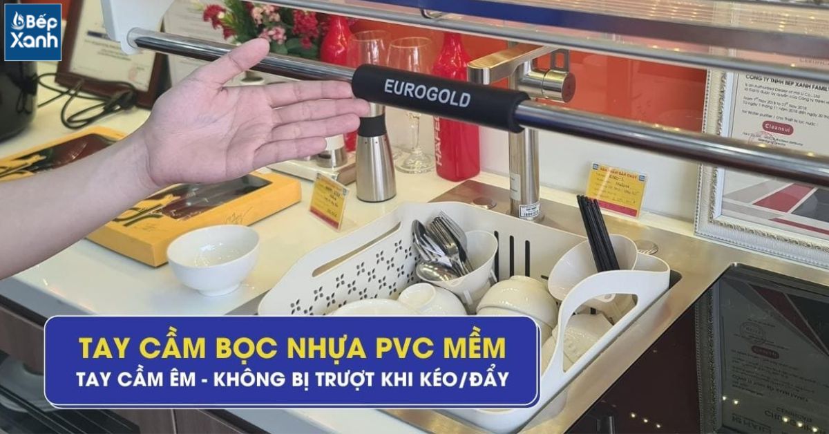 Phần tay cầm của sản phẩm được bọc một lớp nhựa PVC mềm mại màu đen giúp êm ái khi sử dụng và không bị trượt khi nâng lên, hạ xuống. Tại lớp bọc màu đen được thiết kế in chữ Eurogold sang trọng.
