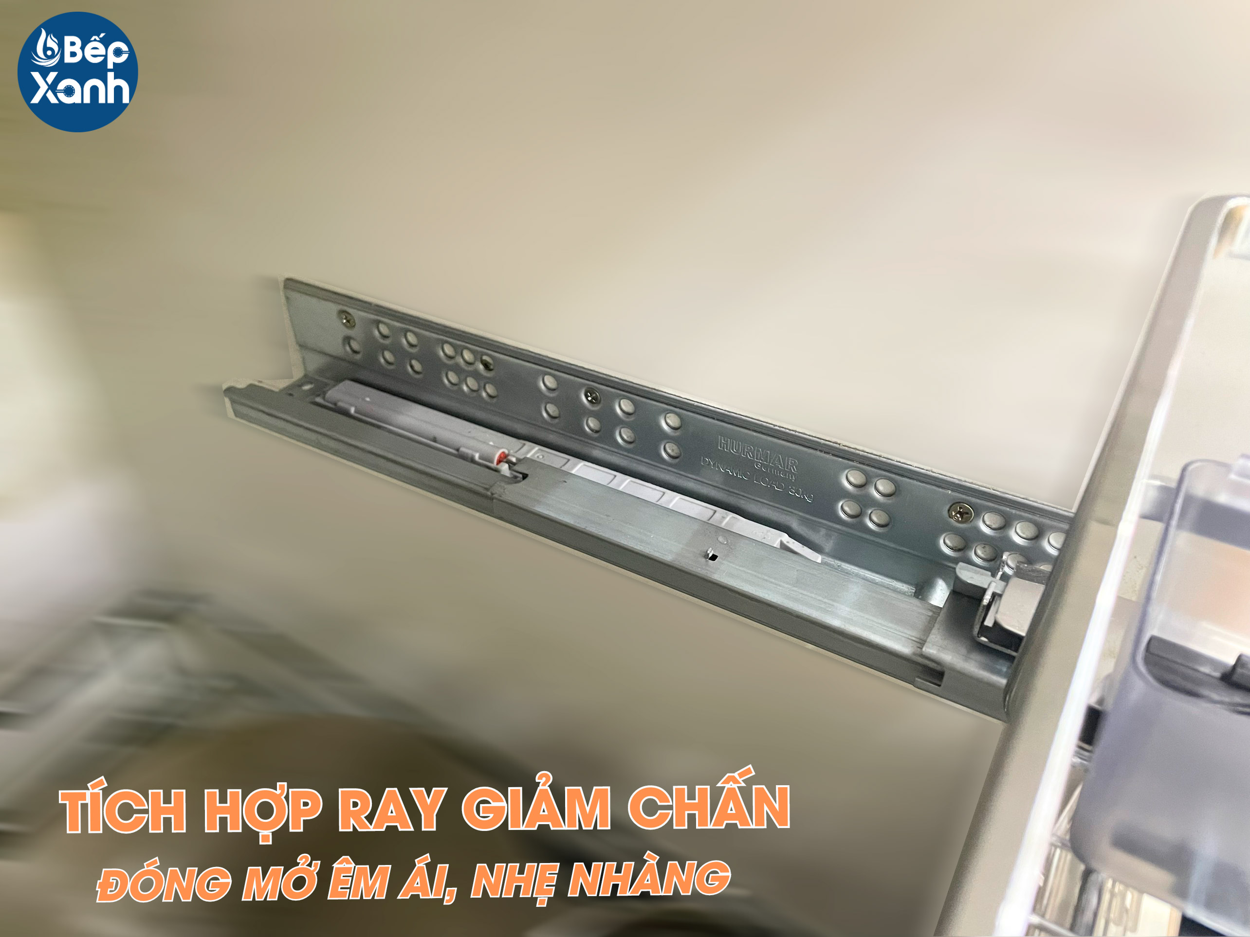 Sản phẩm được trang bị hai ray trượt giảm chấn tiện lợi, giúp kệ di chuyển êm ái và mượt mà. Nhờ đó, bạn không cần dùng nhiều sức lực để kéo ra, chỉ cần chạm nhẹ là có thể dễ dàng nhìn thấy toàn bộ chén bát bên trong kệ.