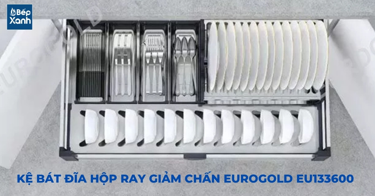 giá bát đĩa tủ dưới Eurogold EU133600 còn trang bị khay chia đũa, thìa tiện lợi bên trong.