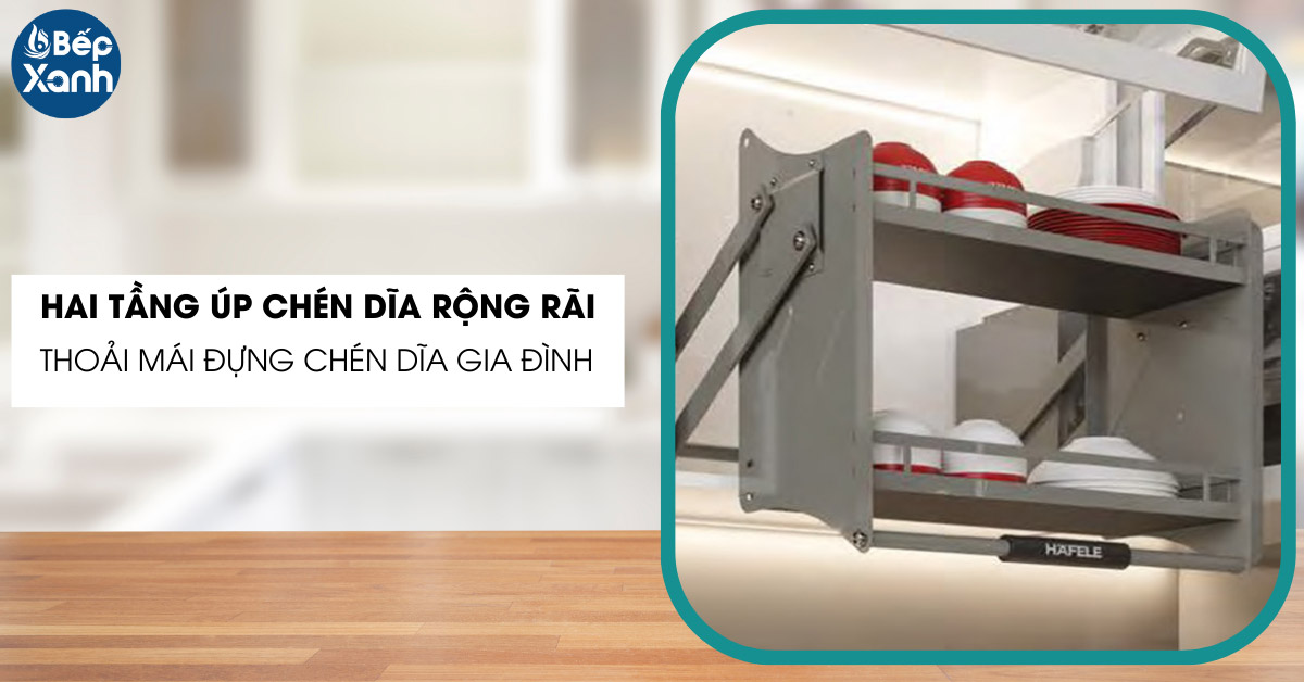 Kệ bát đĩa nâng hạ được hãng Hafele thiết kế với cấu trúc gồm 2 tầng úp chén đĩa rộng rãi, giúp người dùng dễ dàng đựng đủ số lượng chén bát trong gia đình. Tầng trên của kệ được thiết kế đặc biệt để úp dĩa trong khi tầng dưới thuận tiện cho việc úp tô, chén ly,...