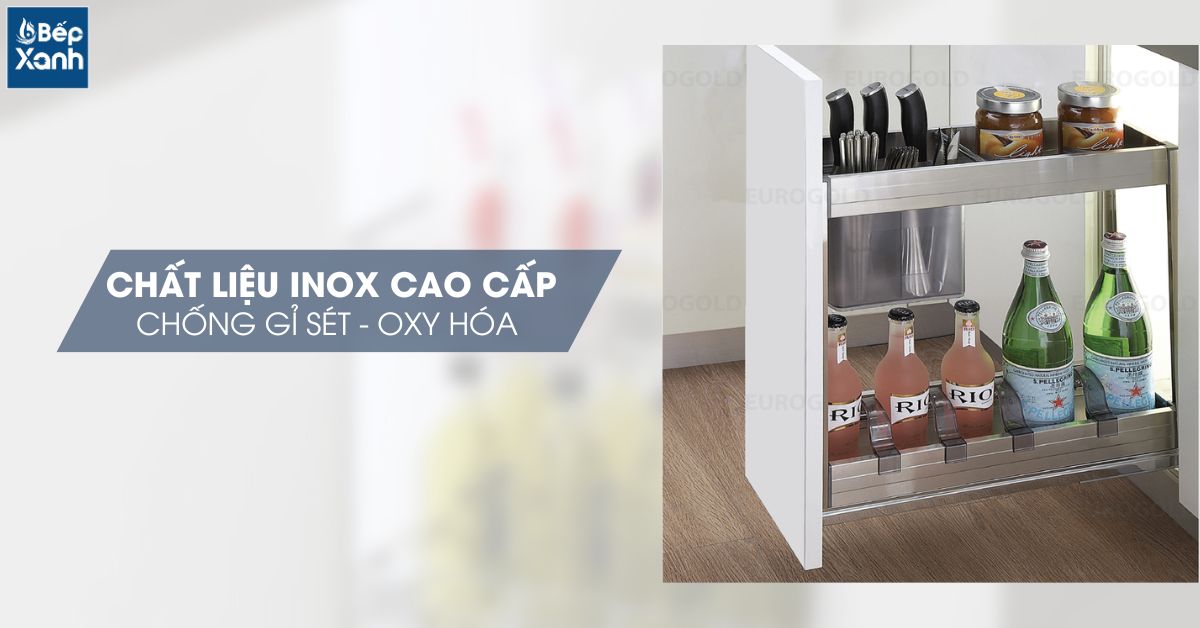 Trang bị thêm khay đựng nước tiện lợi làm nổi bật ưu điểm của sản phẩm. Vì vậy, sản phẩm kệ gia vị Eurogold được mọi người yêu thích nhờ vào khay chứa nước thừa phía dưới cùng giúp hứng phần nước vô tình đổ vào nhằm bảo vệ tủ bếp luôn khô thoáng trách bị ẩm mốc hư hỏng.