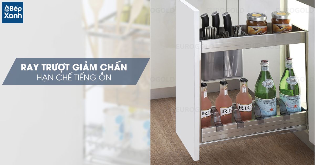 Sản phẩm là phụ kiện tủ bếp với tính năng ray trượt giảm chấn giúp bạn đóng/mở mượt mà, hạn chế va đập mạnh. Thiết kế ray trượt giảm chấn sẽ nhẹ nhàng khi sử dụng, không tốn quá nhiều sức để kéo ra, giảm thiểu tiếng ồn hiệu quả.