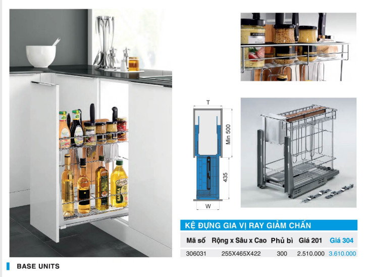 Dùng cho các khoang tủ phủ bì có không gian nhỏ nhằm tận dụng tối đa khoảng không trong 1 căn bếp hiện đại. Giá chai lọ được mở ra toàn phần giúp lấy đồ cực kỳ dễ dàng và tiện lợi. Giá gia vị, chai lọ HIGOLD có thể lắp âm với cánh mở hoặc có thể gắn cánh và kéo ra.