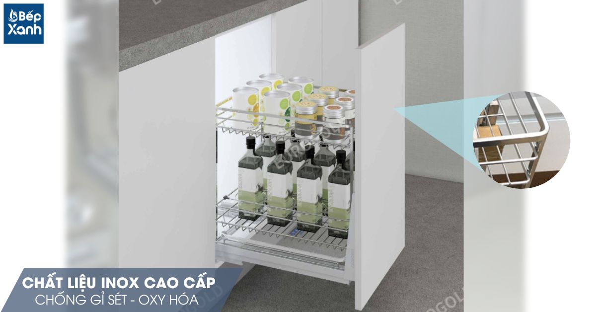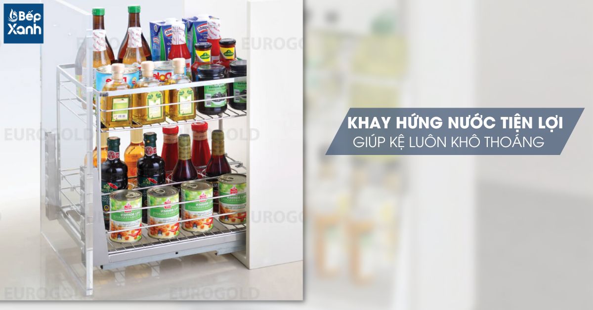 Một điểm cộng cho sản phẩm này chính là khay hứng nước hữu ích. Kệ gia vị chai lọ dao thớt trang bị thêm khay chứa nước phía dưới cùng giúp bạn hứng phần nước vô tình đổ vào nhằm bảo vệ tủ bếp luôn khô thoáng trách bị ẩm mốc.