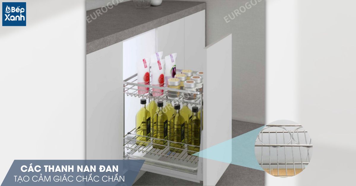 Eurogold ERO2040B2 được thiết kế dạng nan đan với các thanh nan chắc chắn tạo cảm giác độ bền và độ chắc khi sử dụng. Khoảng cách giữa các thanh nan được thiết kế nhất định, giúp bạn dễ dàng lưu trữ và sắp xếp các loại gia vị một cách ngăn nắp, không bị chồng lên nhau, giúp cho bạn có thể tìm kiếm và sử dụng gia vị một cách dễ dàng hơn. Điều này giúp cho các loại gia vị được bảo quản tốt hơn, không bị ẩm mốc hay hư hỏng.