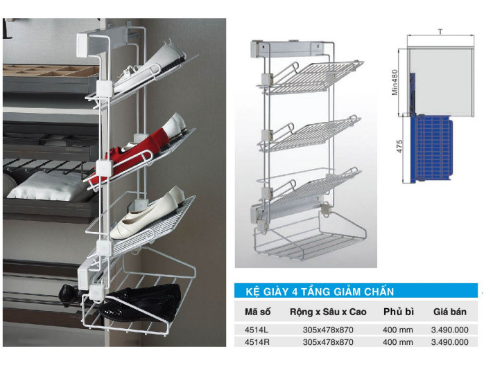 Kệ giày 4 tầng giảm chấn: Khung rổ lắp trong tủ quần áo có 4 tầng , làm bằng inox đây là giải pháp tối ưu hóa diện tích có trong tủ đựng quần áo.