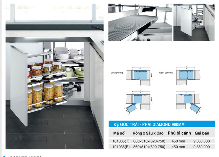 Kệ góc trái phải diamond giảm chấn 900mm 101035, 101036: Thiết kế dành cho tủ bếp dưới, tận dụng hết mọi góc khuất tủ bếp cho bạn không gian lưu trữ chén bát, dĩa, xoong nồi, chai lọ, đồ khô,… rất lí tưởng tăng diện tích để, mở rộng được không gian bếp. Kệ góc trái – phải diamond được tích hợp ray trượt giảm chấn chuyển động cực kỳ nhẹ nhàng, êm ái, vô cùng trơn tru khi đóng hay mở tủ. Là chiếc kệ thông minh luôn mang đến những tiện nghi nhất cho người nội trợ khi vào bếp khi nấu nướng được nhanh chóng, không quá nhiều thời gian của mình.