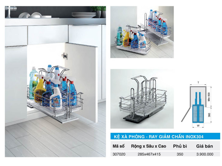 Kệ xà phòng – ray giảm chấn inox 304 Tủ bếp ngoài việc cất các dụng cụ, đồ dùng, thực phẩm bếp thì cũng là nơi để cất giữ các hóa chất tẩy rửa trong nhà bếp, việc có một ngăn riêng để cách ly các chất độc hại là rất cần thiết. Với thiết kế kệ trên khay trượt giúp bạn dễ dàng lấy các chai hóa chất trong tủ bếp và cất chúng vào sâu bên trong.