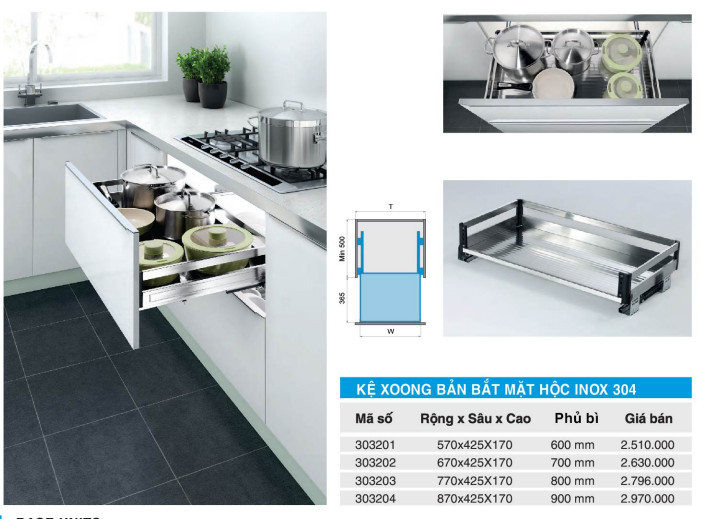 Kệ xoong bản bắt mặt hộc inox 304: được gia công bằng chất liệu inox 304 cao cấp chống rỉ sét và bền đẹp, kệ sử dụng ray giảm chấn kéo mở đóng nhẹ nhành êm ái. Được thiết kế dạng bản chắc chắn, trọng tải lớn nên bạn hoàn toàn yên tâm khi để xoong nồi mà không bị đổ vỡ, kệ có nhiều kích thước cho bạn thoải mái lựa chọn phù hợp với nhu cầu sử dụng.