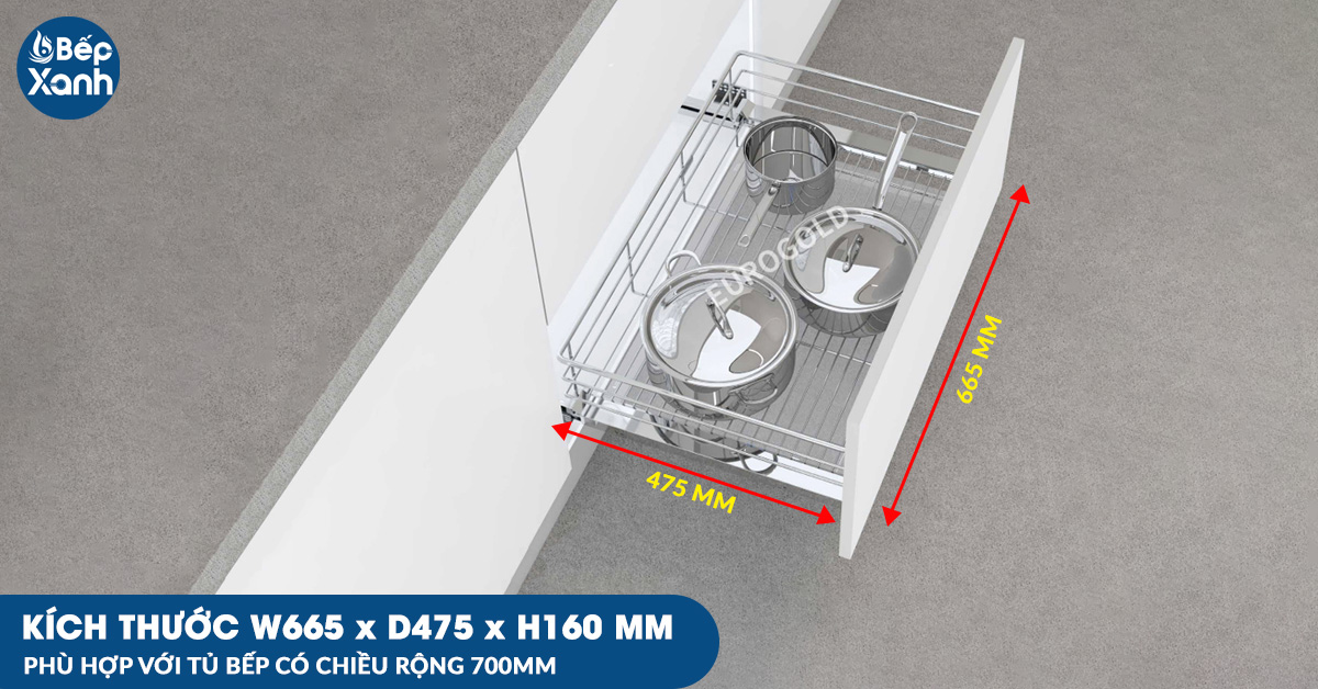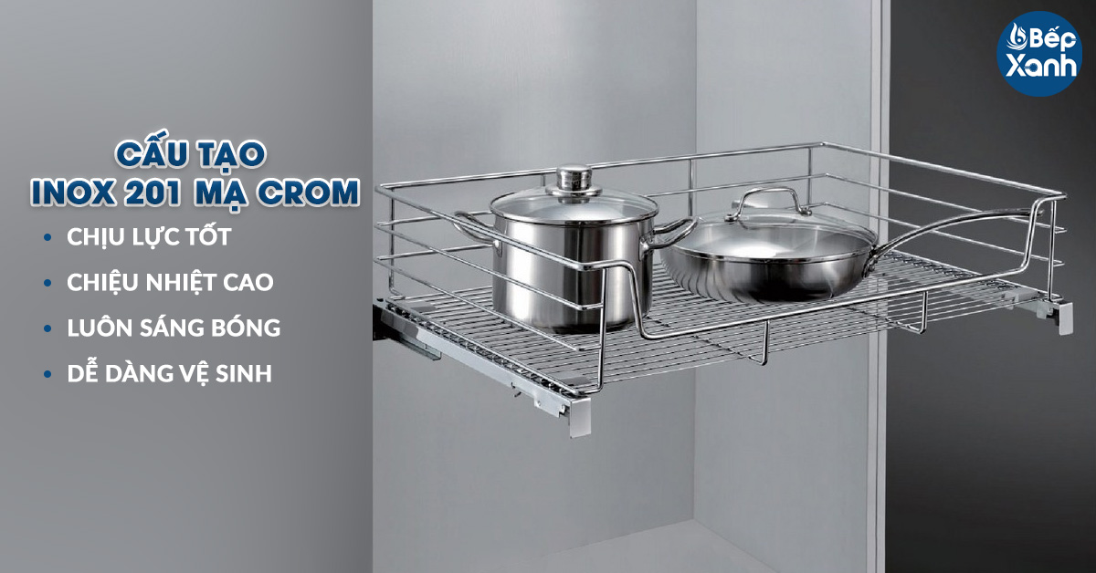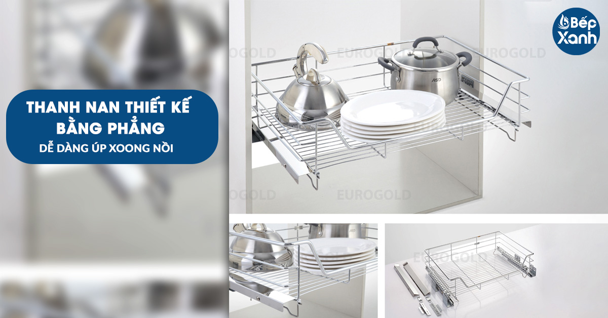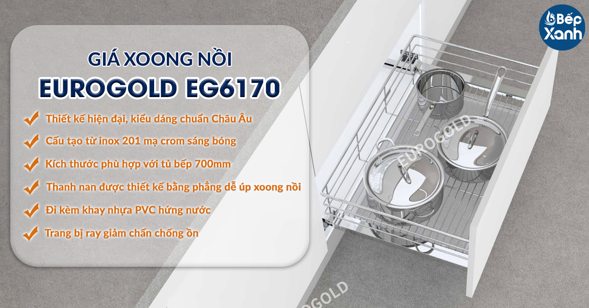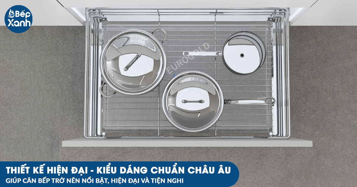 Kệ xoong nồi Eurogold EG6170 được cấu tạo từ chất liệu inox 201 mạ crom cao cấp - bền bỉ, cùng với kiểu dáng chuẩn Châu Âu hiện đại, đem đến tổng thể cho sản phẩm một vẻ đẹp sang trọng và tinh tế. Bên cạnh đó, sản phẩm tích hợp phụ kiện đi kèm tiện lợi như khay nhựa cao cấp, ray giảm chấn chống ồn. Sản phẩm được bảo hành 2 năm, giao - lắp miễn phí.