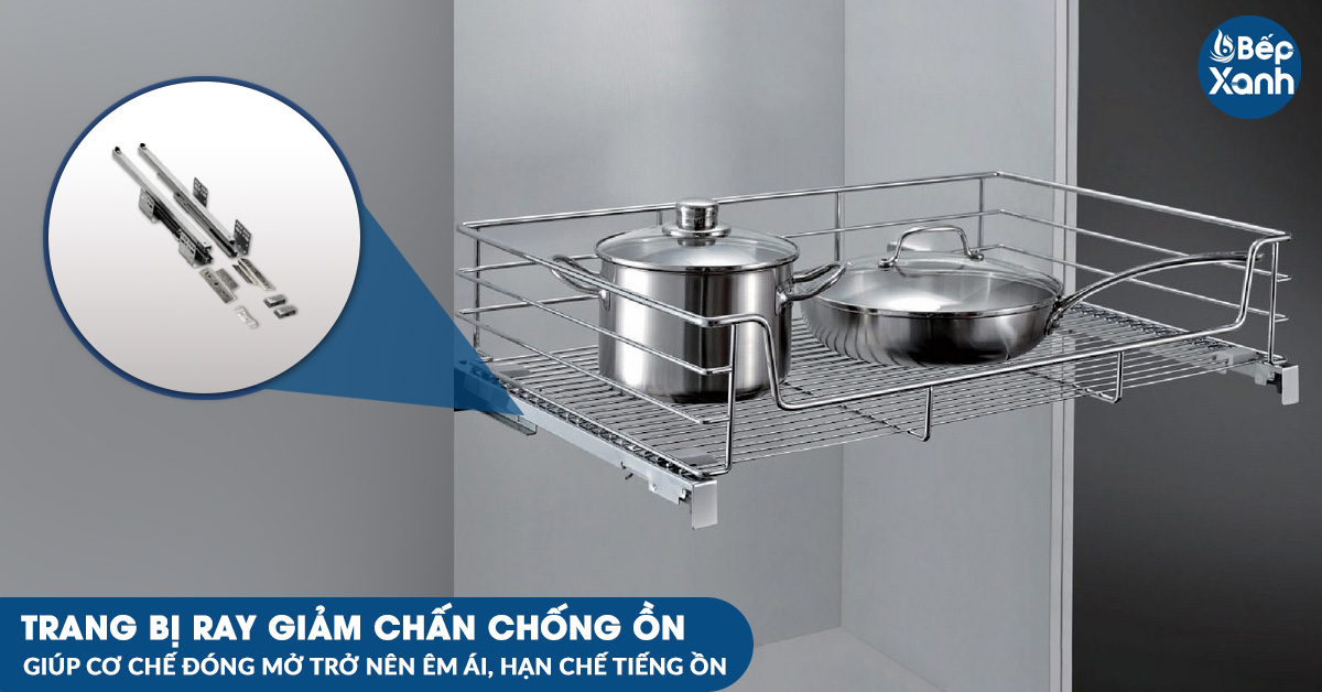 Đi kèm với kệ Eurogold EG6170 chính là bộ phận ray giảm chấn chống ồn giúp khách hàng đóng mở dễ dàng, chỉ cần thao tác mở tủ, khách hàng có thể thay toàn bộ phần kệ úp xoong nồi được di chuyển ra ngoài. Bên cạnh đó, bộ phận giảm chấn còn giúp giảm tiếng ồn tối đa và bảo vệ vật dụng tránh va chạm vào nhau kể cả khi khách hàng vô tình đóng tủ mạnh.