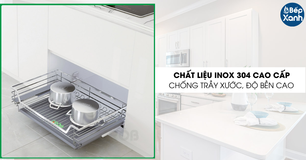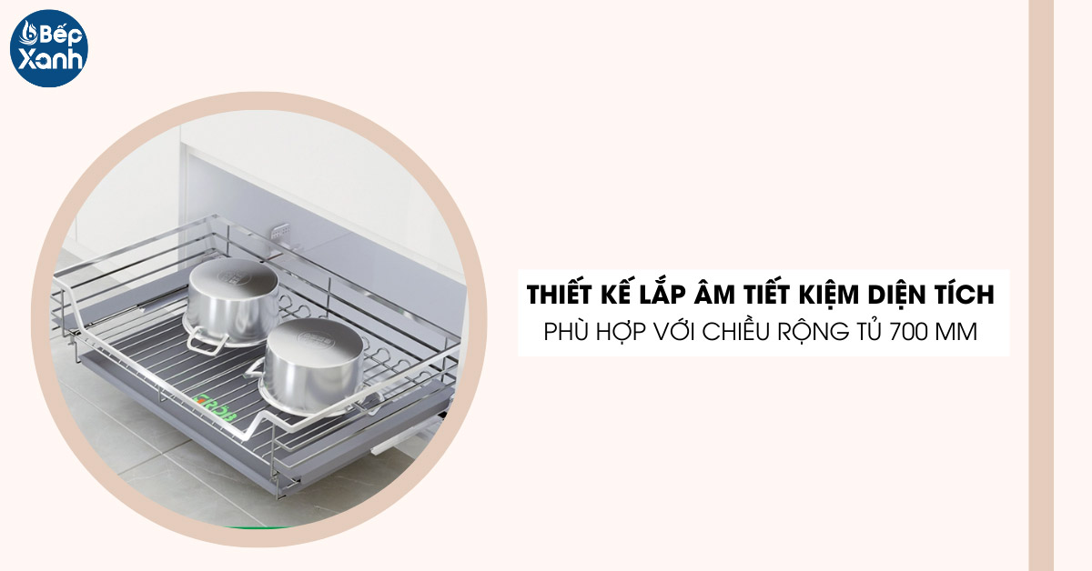 Kệ xoong nồi tủ dưới này có kích thước lý tưởng để lắp đặt trong tủ rộng 700mm, kích thước phổ biến trong các căn bếp hiện đại. Kích thước này không chỉ giúp kệ vừa vặn hoàn hảo trong tủ bếp mà còn mang lại không gian lưu trữ rộng rãi, đủ để sắp xếp các dụng cụ bếp một cách ngăn nắp và tiện lợi. Việc sắp xếp các xoong nồi, chén đĩa sẽ trở nên dễ dàng, nhanh chóng, giúp bạn tiết kiệm thời gian trong quá trình nấu nướng.
