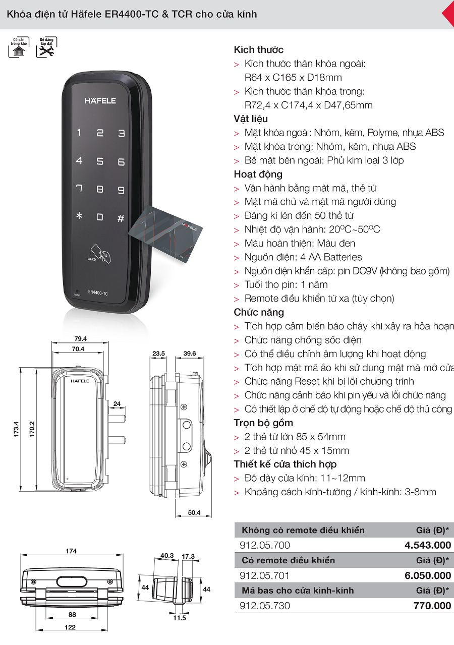 Khóa điện tử Hafele ER4400-TC 912.05.700 được sử dụng lắp đặt cho cửa kính có độ dày cửa: 11-12mm, sử dụng mật mã/thẻ từ để mở cửa. Hệ thống khóa cửa kính này có khả năng ghi nhận tới 50 thẻ từ và 50 mã số rất thích hợp cho những nơi chung cư cao tầng, các phòng ban làm việc...