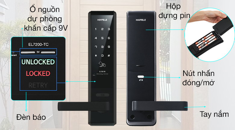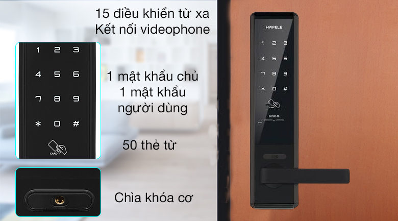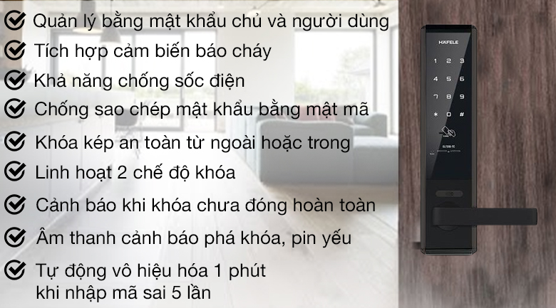 - Khóa điện tử quản lý bằng mật khẩu chủ và mật khẩu người dùng đảm bảo tính bảo mật khi sử dụng. Khóa điện tử Hafele sẽ có một mật khẩu chủ quản lý toàn bộ hệ thống chức năng của ổ khóa như: thay đổi thẻ từ, thay đổi mật mã đăng nhập,...được bảo mật cao.