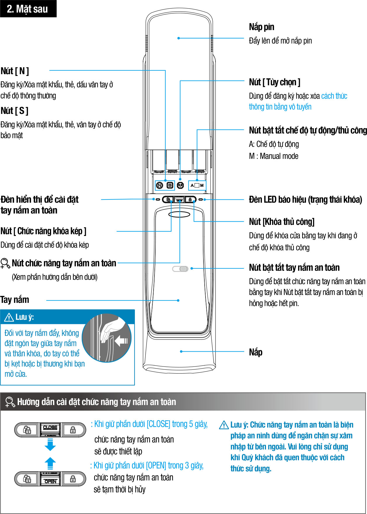 Quản lý khóa với quyền chủ và người dùng, Sử dụng kèm mật mã ảo chống sao chép mật khẩu, Khóa kép an toàn từ phía trong, Tự động khóa sau khi khóa đã được mở nhưng cửa vẫn đang ở vị trí đóng, Hướng dẫn cài đặt bằng giọng nói (Tiếng anh/Trung Quốc), Kiểm tra dung lượng Pin với 3 cấp độ, Âm thanh cảnh báo phá khóa khi có lực mạnh tác động lên mặt ngoài của khóa, Âm thanh cảnh báo khi khóa chưa được đóng hoàn toàn, Âm thanh cảnh báo và tự động vô hiệu hóa 3 phút sau khi nhập sai mã/thẻ/vân tay 5 lần liên tiếp, Âm thanh cảnh báo pin yếu, Chống sốc điệnTay nắm kéo, đẩy và có thể thay đổi theo chiều đóng mở cửa, Khóa tay nắm bên trongThay đổi linh hoạt giữa khóa tự động và thủ công, Âm lượng của khóa có thể điều chỉnh