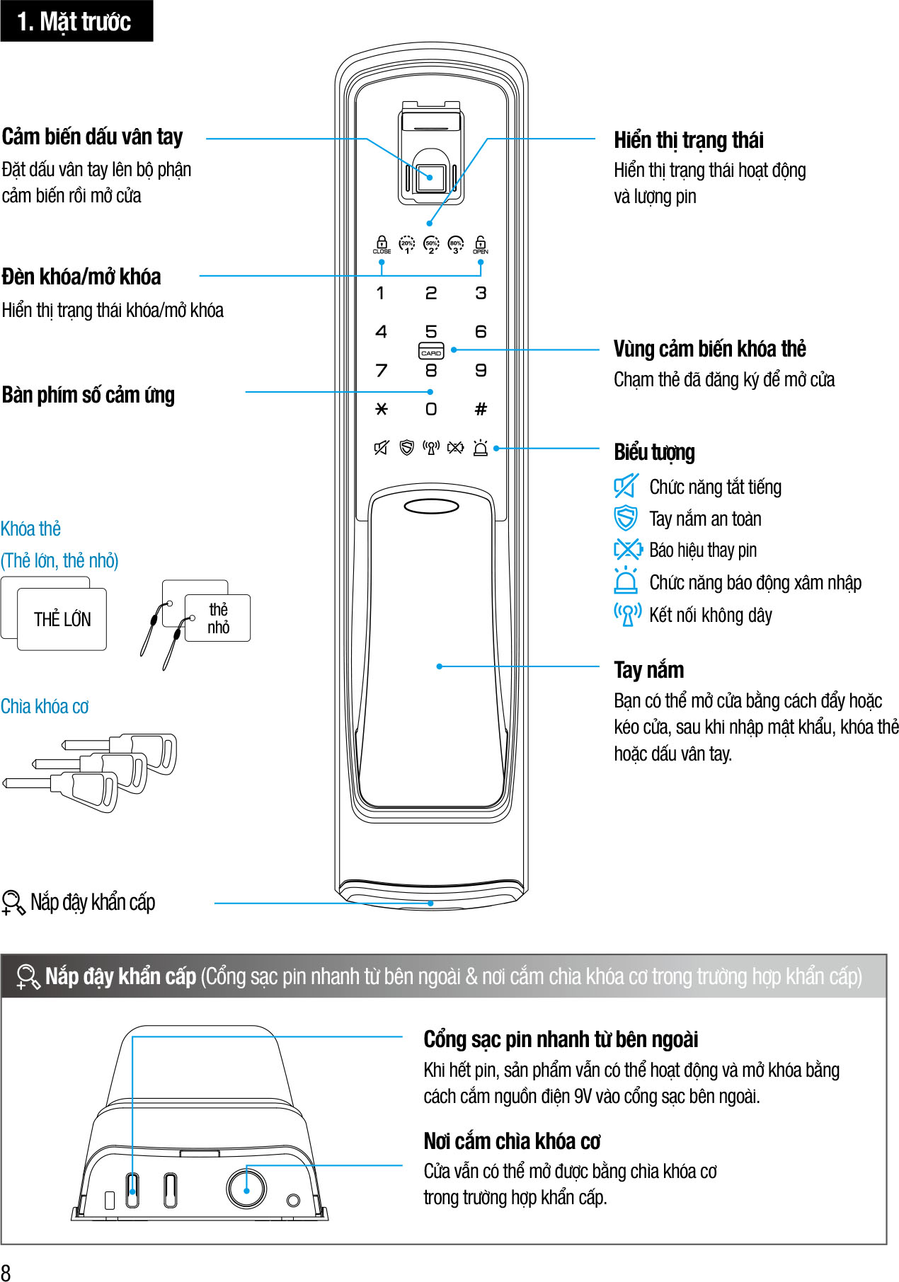 - Kiểu mở: Vân tay, Thẻ từ, Kết nối videophone, Mã số, Điều khiển từ xa, Chìa khoá cơ
