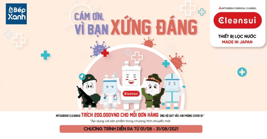 Nhằm tri ân những đóng góp lớn lao và san sẻ gánh nặng với lực lượng y bác sĩ, nhân viên y tế, các chiến sĩ công an, bộ đội cùng các tình nguyện viên nơi tuyến đầu chống dịch, đồng thời chung tay ủng hộ Quỹ vắc-xin chống Covid-19, từ ngày 01/08 đến ngày 31/08/2021, Mitsubishi Cleansui triển khai chương trình ưu đãi đặc biệt với tên gọi "CÁM ƠN, VÌ BẠN XỨNG ĐÁNG”.