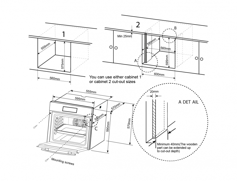 – Kích thước lắp đặt: ( Dài x rộng x sâu) 560 x 575 x 555mm.