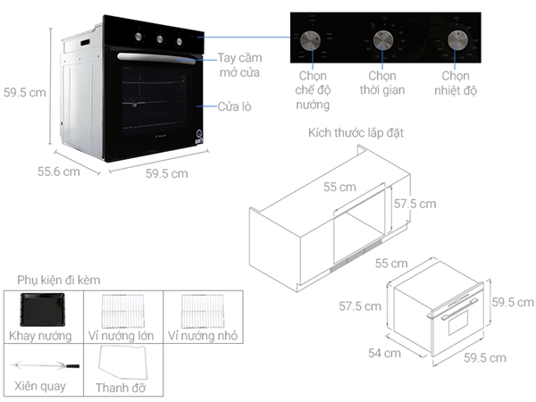 Thiết kế nhỏ gọn, sang trọng: Sản phẩm sở hữu thiết kế cứng cáp, sang trọng phù hợp với nhiều không gian bếp. Kích thước lò59.5x56.5x59.5cm là kích thước phù hợp với nhiều gia đình. Đặc biệt thiết kế âm tủ giúp tiết kiệm diện tích, nhờ đó có thể lắp đặt tại nhiều vị trí, phù hợp với cả những không gian có kích thước nhỏ hẹp.