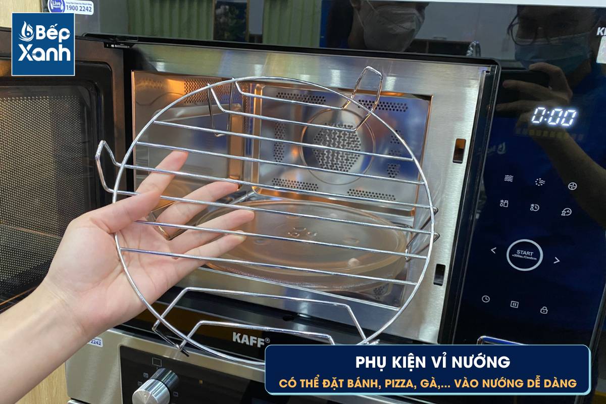 Lò vi sóng âm tủ Kaff có phụ kiện là vỉ nướng bằng chất liệu inox, thiết kế 3 chân vững chãi hỗ trợ nướng các loại BQQ, pizza, bánh mì,... dễ dàng. Vỉ nướng có thể tháo ra và vệ sinh sau mỗi lần nướng.