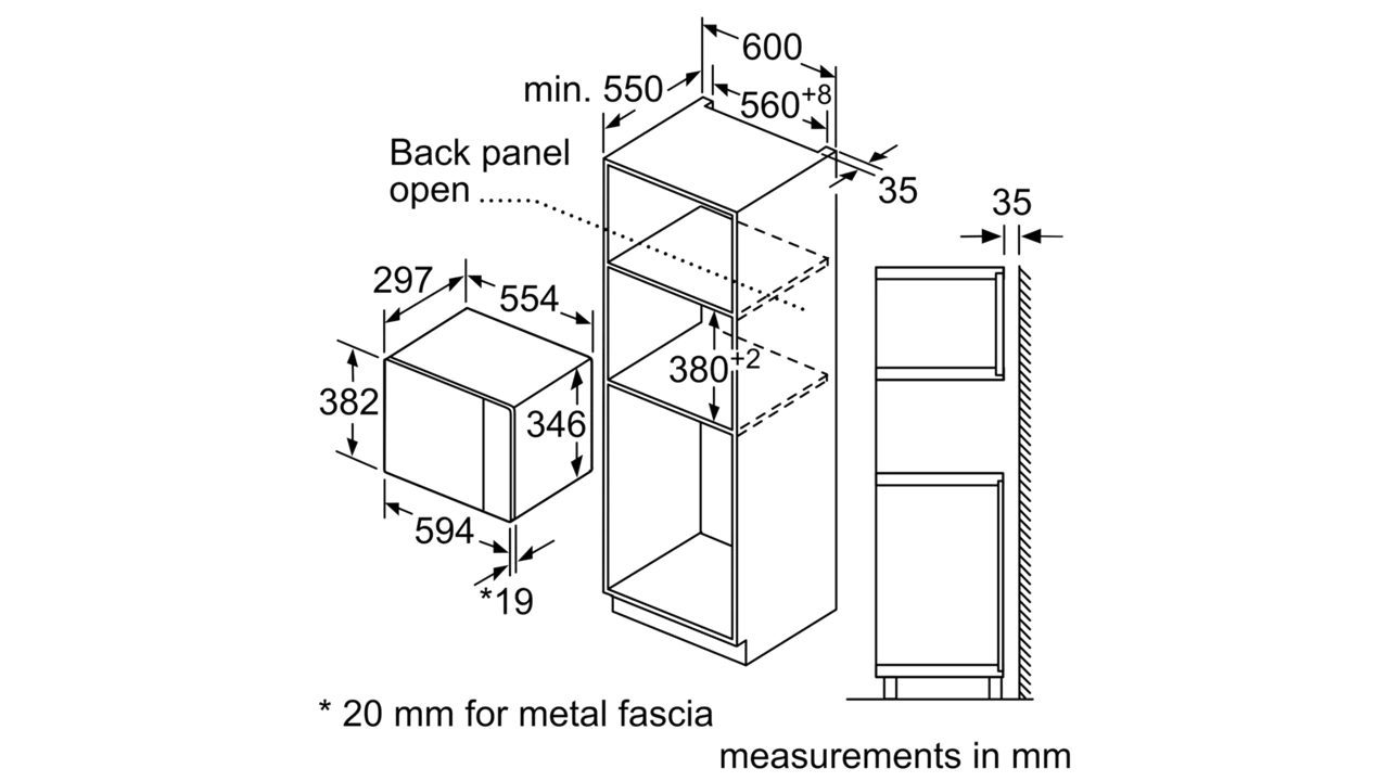 Bên trong khoang lò vi sóng âm tủ làm từ chất liệu thép không gỉ với dung tích 20L, có thể nấu và rã động khối lượng lớn thực phẩm, đáp ứng tốt cho gia đình nhiều thành viên.