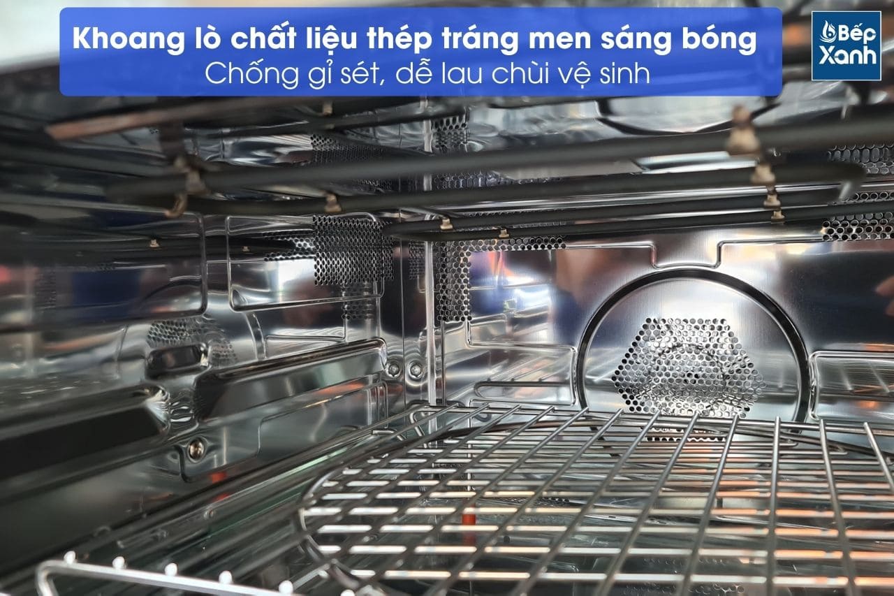 Ngoài ra, khoang lò chất liệu thép không gỉ có khả năng chống oxi hóa tốt, bề mặt luôn sáng bóng, vệ sinh dễ dàng.