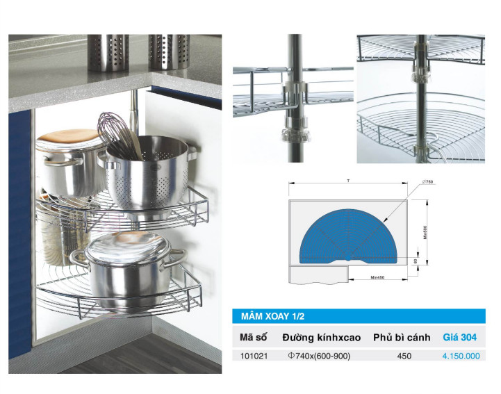 Mâm xoay 1/2 Higold có dạng hình bán cầu, 2 tầng gắn với 1 trục xoay linh hoạt. Đáy được thiết kế bằng nhiều thanh cong inox ghép lại tạo thành mặt phẳng đỡ xoong, nồi… giúp kệ không bị trữ nước, bụi bặm tiện lợi để cất giữ trực tiếp vừa với rửa xong chưa ráo nước.