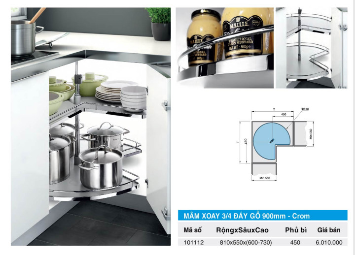 Mâm xoay 3/4 đáy gỗ 900mm: Được thiết kế với mặt kệ là một hình tròn bị khoét góc vuông để khớp với góc tủ sẽ giúp bạn cất giữ, lấy độ một cách linh hoạt, không cần phải với tay quá sâu vào bên trong vì chỉ cần xoay nhẹ là mọi thứ bạn cần sẽ được trưng ra trước mắt bạn. Chất liệu bằng inox cao cấp nhất trên thị trường sẽ giúp góc bếp của bạn sáng bóng, việc vệ sinh, lau chùi sẽ nhanh chóng và nhẹ nhàng đến không ngờ.