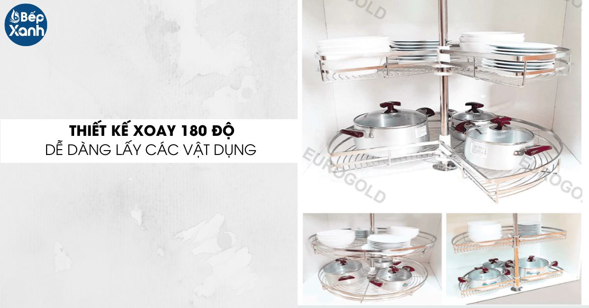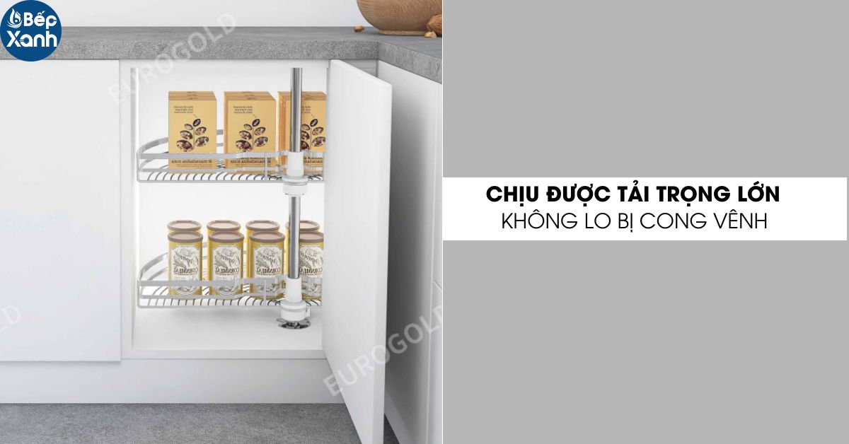 Mâm xoay inox nan mở 1/2 Eurogold EPL180A là sản phẩm được thiết kế để chịu tải trọng lớn, đảm bảo an toàn và tiện lợi cho việc sắp xếp và lưu trữ các vật dụng trong tủ bếp. Với khả năng chịu tải trọng lớn, Eurogold EPL180A có thể chứa được nhiều đồ dùng khác nhau mà không lo bị biến dạng hay hư hỏng. Ngoài ra, khả năng chịu tải trọng cao cũng giúp sản phẩm trở nên bền bỉ và an toàn trong suốt quá trình sử dụng. Sản phẩm kệ góc tủ bếp này sẽ là một lựa chọn tốt để tối ưu không gian lưu trữ và sắp xếp đồ dùng trong tủ bếp.