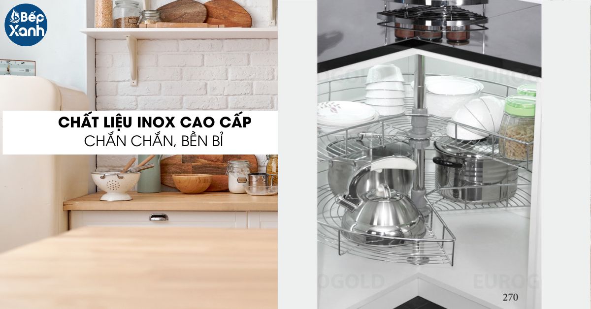 Mâm xoay inox nan mở 3/4 Eurogold TR270E được làm từ chất liệu inox mạ crom cao cấp, một loại vật liệu rất được ưa chuộng trong ngành công nghiệp chế tạo các phụ kiện tủ bếp. Inox mạ crom mang lại cho sản phẩm có độ bền cao, khả năng chống ăn mòn và độ bóng bề mặt lâu bền. Chất liệu này còn có tính năng dễ dàng vệ sinh, chịu nhiệt tốt và không gây ảnh hưởng xấu đến sức khỏe con người. Vì vậy, khi lựa chọn mâm xoay inox Eurogold TR270E, bạn sẽ yên tâm về độ bền, sự an toàn và dễ dàng vệ sinh của sản phẩm.