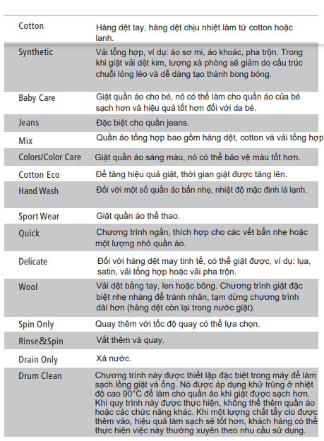 Chi tiết chương trình giặt của máy Malloca MWM-09SIL: