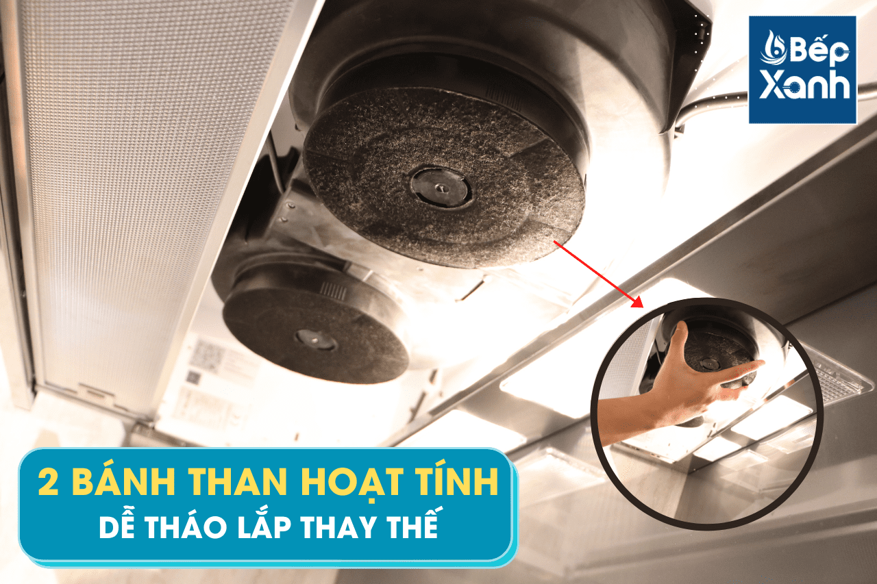 Bên trong động cơ máy hút mùi âm tủ là 2 bánh than hoạt tính, khử mùi tuần hoàn tốt giúp không gian bếp luôn thông thoáng và sạch mùi. Với bánh than này, bạn có thể tháo ra và thay mới để tăng hiệu quả hút mùi (khoảng 6 tháng/lần).