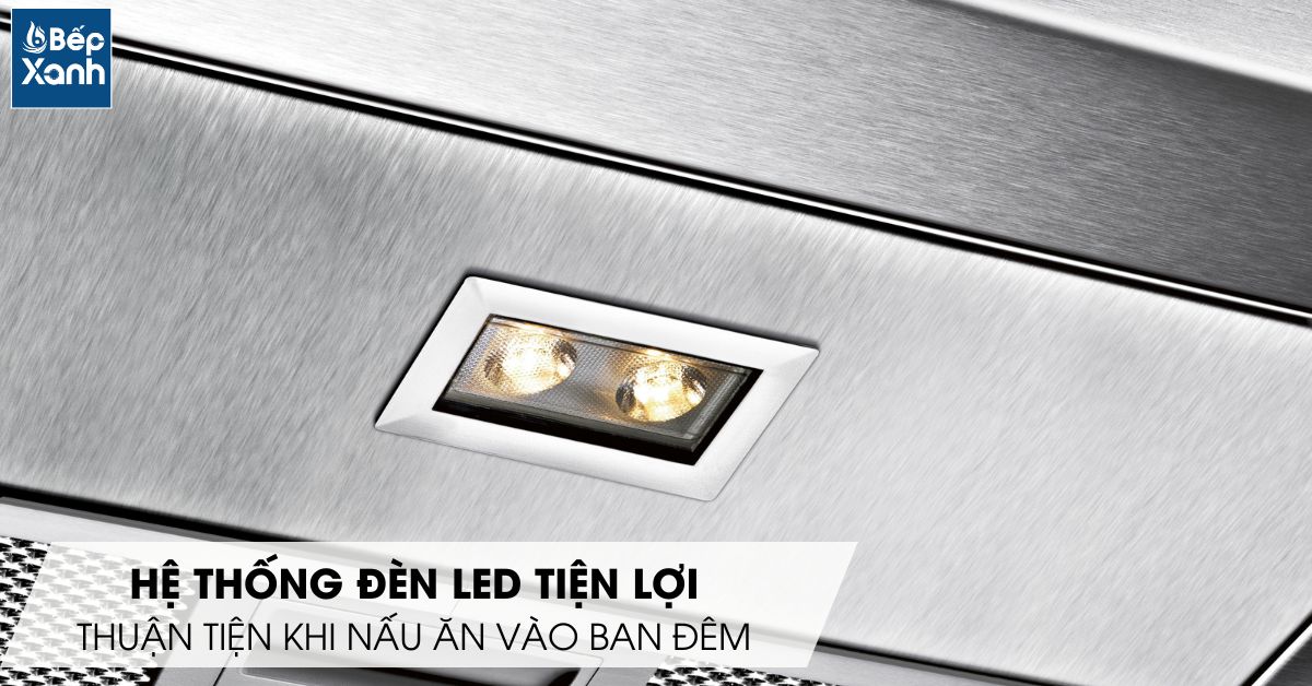 Hệ thống chiếu sáng bằng đèn Led gồm 3 chiếc với công suất mỗi đèn 3W giúp chiếu sáng bếp khi nấu ăn được tiện lợi dễ dàng cùng với chức năng điều chỉnh độ sáng tăng (giảm) dần giúp mắt chúng ta nhìn sẽ thỏa mái dễ chịu hơn.