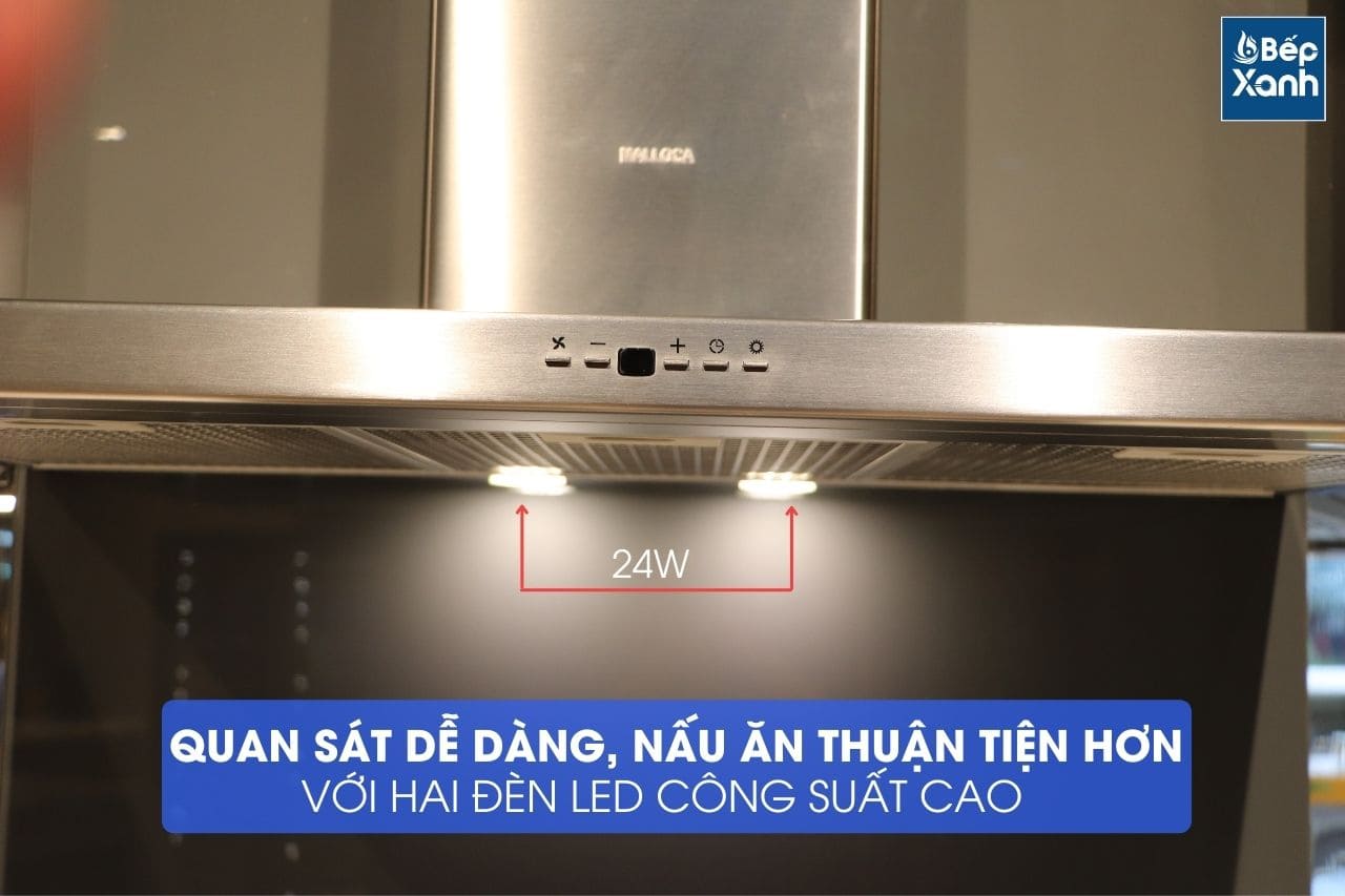 Máy hút mùi được trang bị 2 đèn LED công suất mỗi bóng 12W mang đến sự ấm áp cho không gian bếp, đồng thời tăng độ sáng cho khu vực nấu nướng. Chính điều này giúp bạn vừa nấu nướng dễ dàng vừa tiết kiệm điện năng trong quá trình sử dụng.